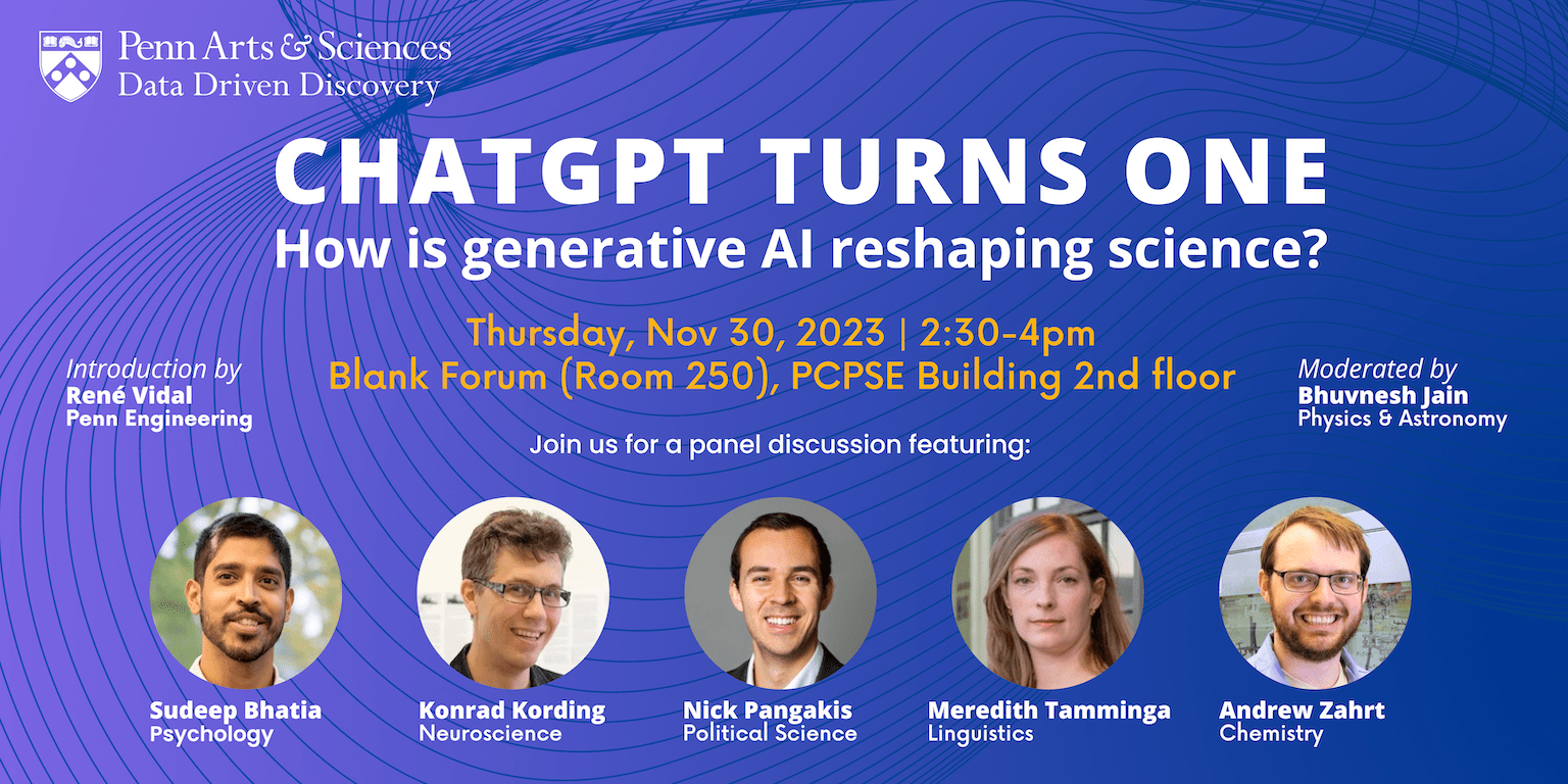The Data Driven Discovery Initiative is hosting a panel discussion on generative AI entitled "ChatGPT turns one: How is generative AI reshaping science?"