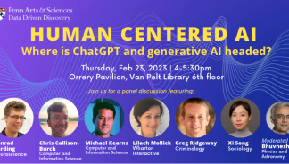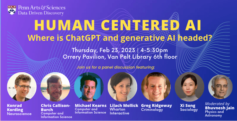 The arrival of ChatGPT has sparked lively debate about how generative AI will impact universities like ours and society at large. Penn faculty have been at the forefront of tracking the impact of AI across diverse fields including the sciences, technology, media and business. We are at a potentially transformative moment in the use of AI, with tantalizing opportunities and challenges ahead. Please join us for a panel discussion hosted by Penn’s Data Driven Discovery Initiative on "Human Centered AI: Where is ChatGPT and Generative AI Headed?" The event will take place on Thursday, Feb 23 at 4pm in the Orrery Pavilion (6th floor of Van Pelt Library)